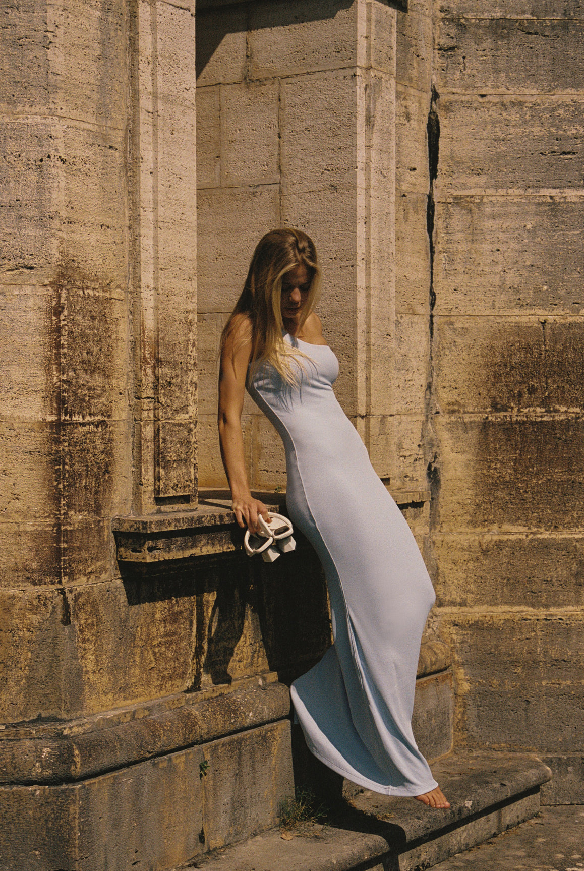 Embrace timeless elegance with this one-shoulder sleeveless dress. Its asymmetrical design, combined with a unique hand-sewn floral detail, creates a truly captivating look. The cinched waist accentuates your figure, and it pairs perfectly with your favorite shoes.