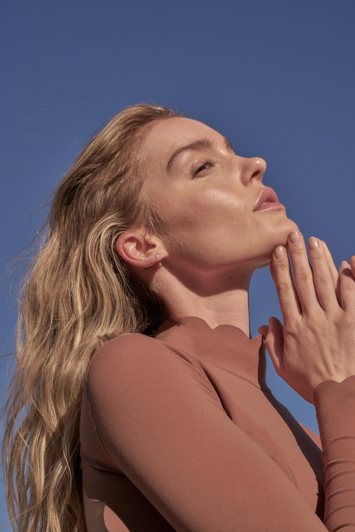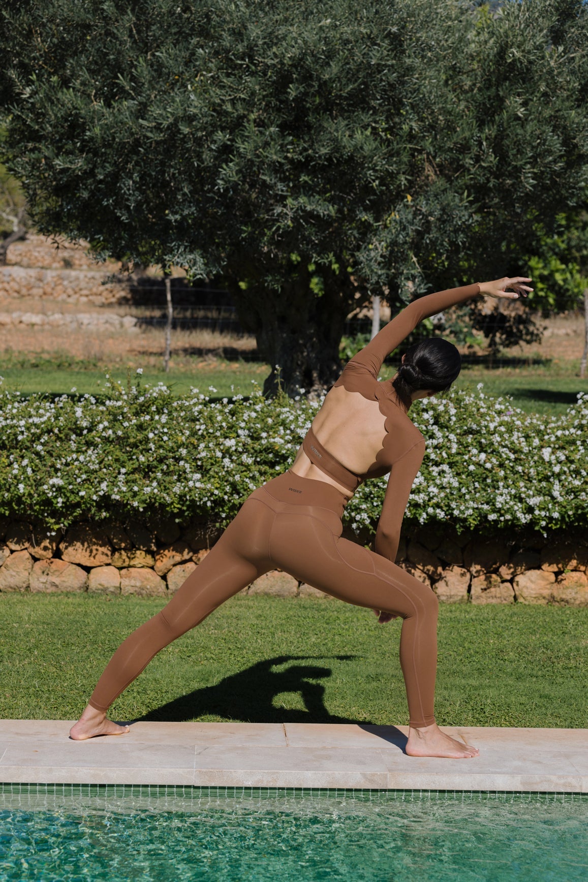 This super-soft classic long sleeve open back top goes with everything. Half-moon scalloped edging and a bold cutout back design is the ultimate charming look, it's a good choice for studio-to-street. Matching high-waisted leggings to start your show-up.